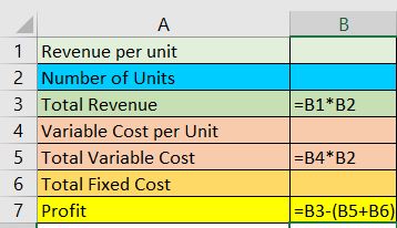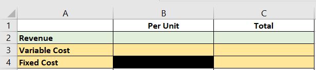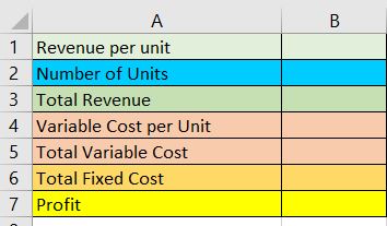 Let’s assign a cell for the total fixed cost, and assign two cells each for revenue and variable costs (per unit, and total):