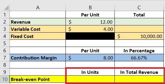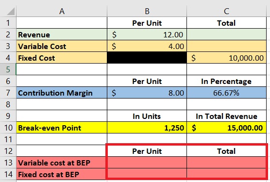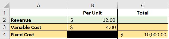 First, we assign two cells for variable and fixed costs at the break-even point (“per unit”, and “total”):