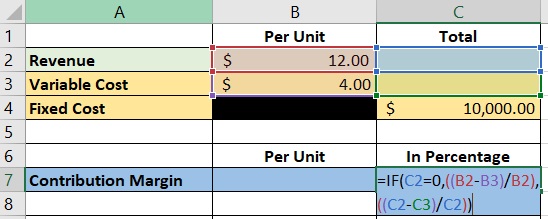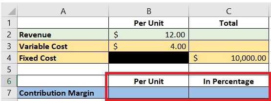 As such, we will be assigning two cells for the contribution margin: “per unit”, and “in percentage”: