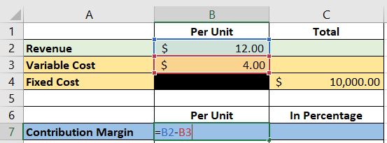 We assigned cell B2 for the revenue per unit, and cell B3 for the variable cost per unit. As such, the formula will be “=B2-B3”.