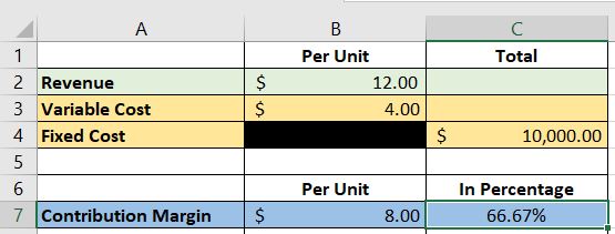 We assigned cell C4 for the total fixed cost, and cell C7 for the contribution margin in percentage.