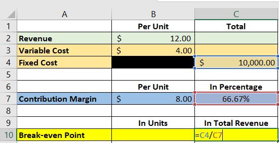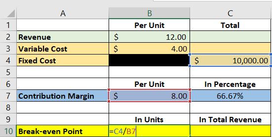Break-even Point = Fixed Cost ÷ Contribution Margin (in percentage)