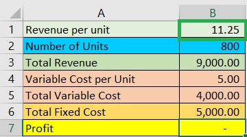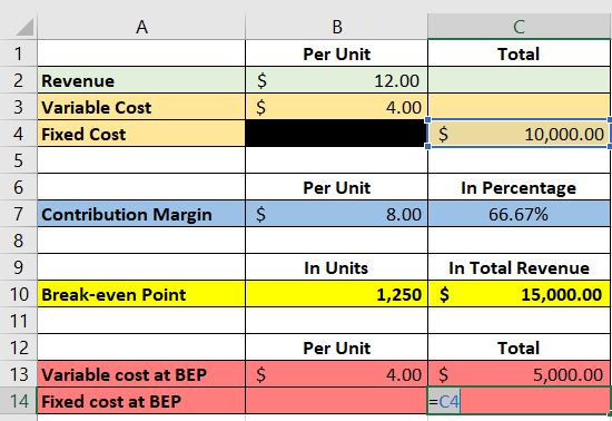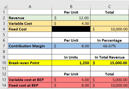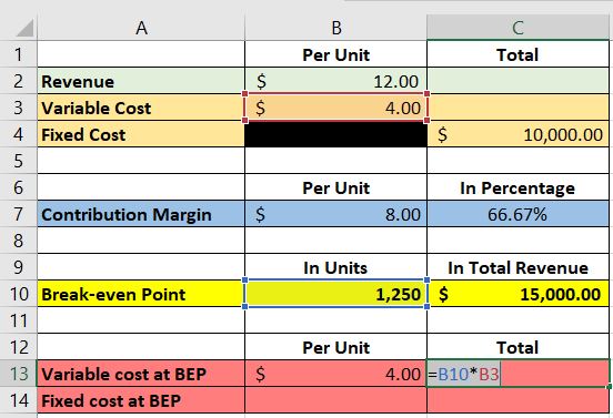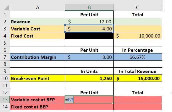As for the variable cost and revenue, you’d generally be using the ‘per unit’ column.