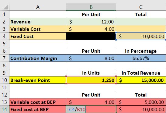 We assigned cell B10 for the break-even point in units, and cell B3 for the variable cost per unit.