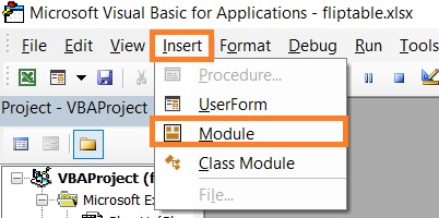 - Open the Insert tab, and then select Module. This will open a window where you will be inserting the VBA code for flipping rows.