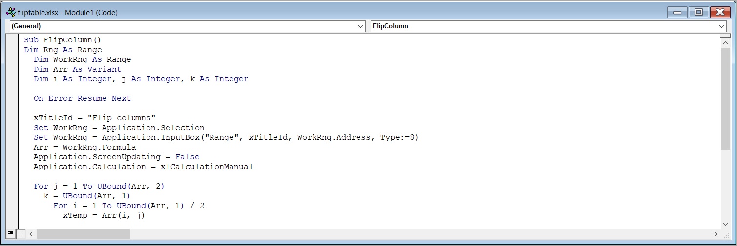 The VBA code that you’ll be using to flip columns in Excel is as follows: