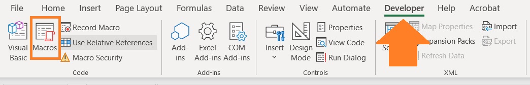 - Close the Visual Basic Editor. Go back to the sheet that you’re working on. Open the Developer tab and press the Macro button. This will open the Macro menu.