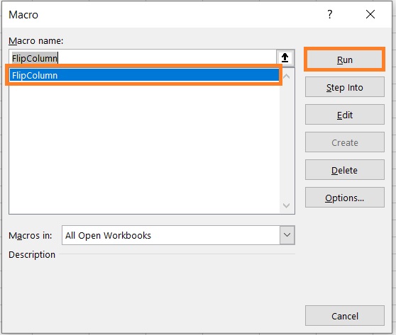 - Select the Macro you just created (FlipColumn) and press run. This will open a window with the title “Flip Columns”.