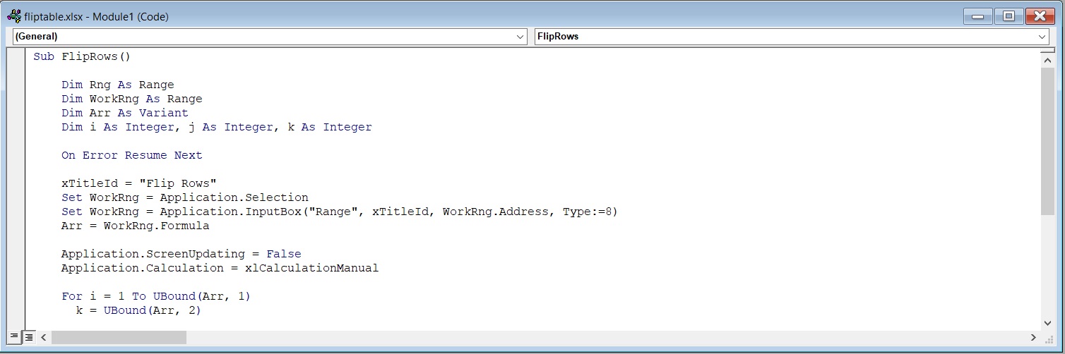 The VBA code that you’ll be using to flip rows in Excel is as follows: