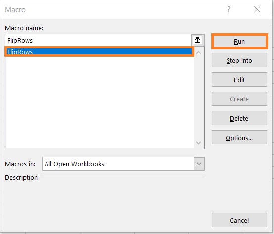 - Select the Macro you just created (FlipRows) and press run. This will open a window with the title “Flip Rows”.